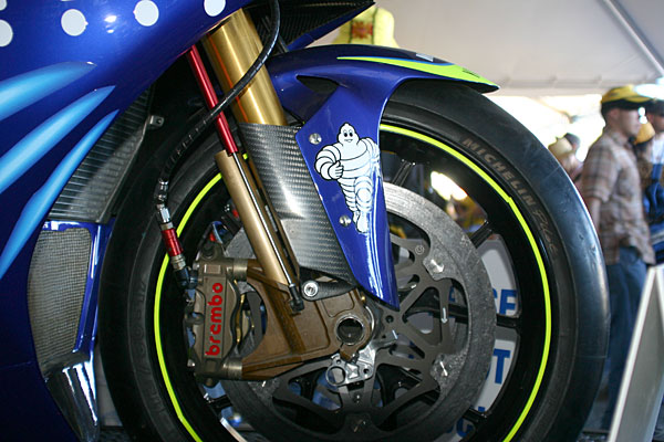 The obligatory Brembo brakes. Note the fork travel sensor.