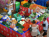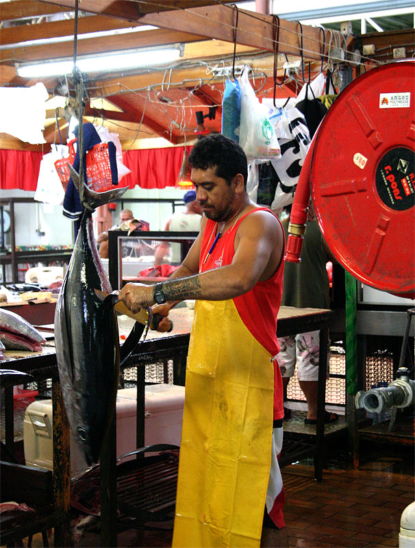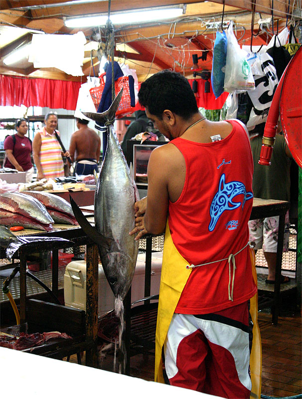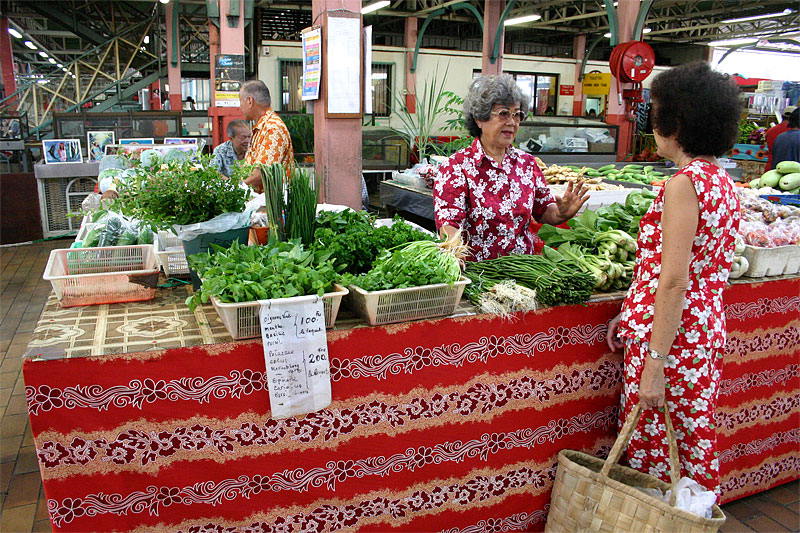 Papeete market, June 2006Papeete, on the island of Tahiti, is the capital of French Polynesia. The municipal market sells everything from fresh produce, to fish and meats, from clothing, to tourist trinkets. There are also a number of eating establishments, with everything from coco glacé to chow-mein-on-baguette sandwiches. The best time to visit is early morning. There is a Champion supermarché just down the road, and it is open all day, but where is the fun in that? |