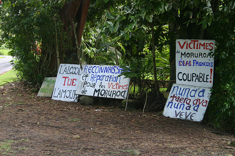 are signs calling for reparations to the victims of Moruroa.